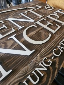 Für das Firmenschild, das wir für eine Außenwerbung hergestellt haben, wurden 1,50 Meter lange Holzbretter verwendet. Diese wurden geflammt und geölt, um eine robuste und rustikale Optik zu erzielen. Das Logo von „Univent Concept“ und „HARZimpuls“ wurden sorgfältig aus Pappelsperrholz ausgeschnitten und auf den Brettern angebracht.